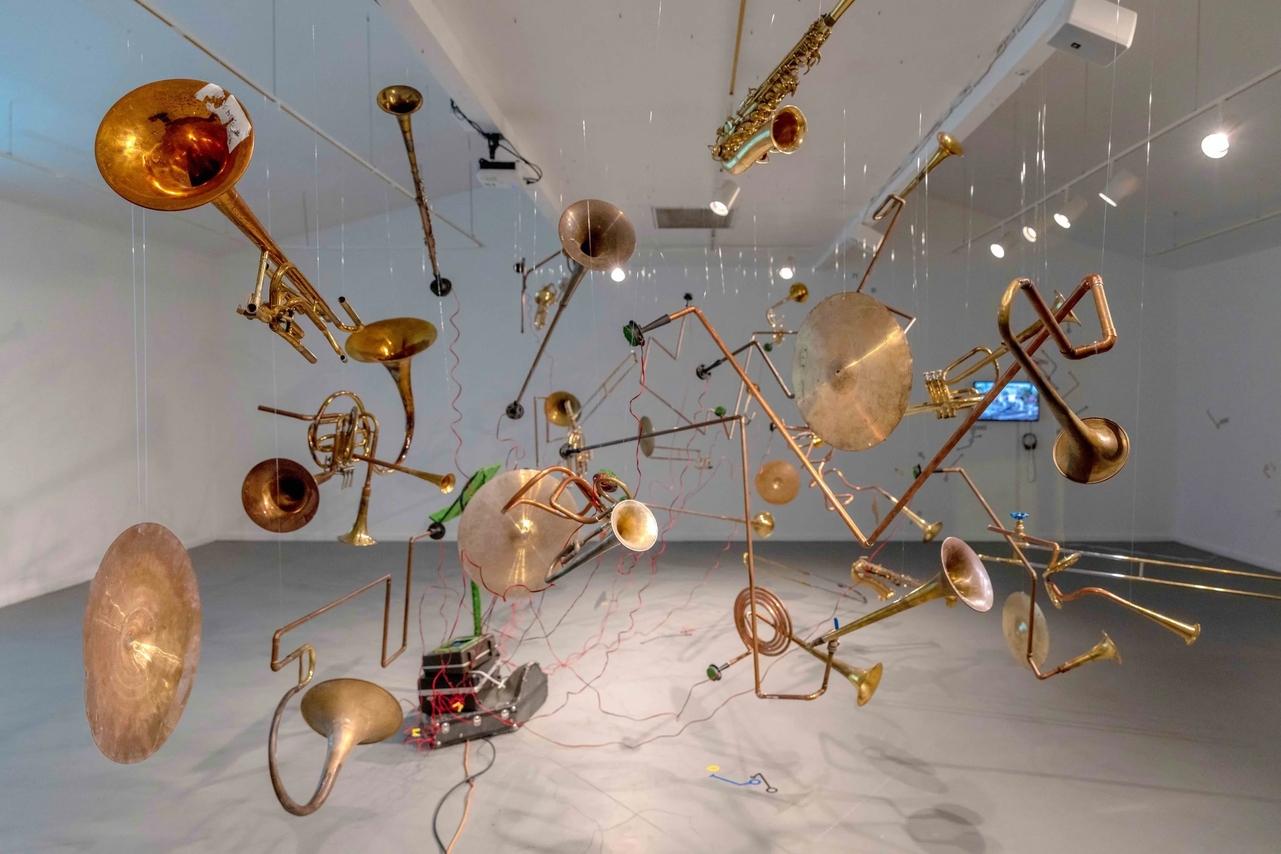 FIGHT SONG is an installation and performance featuring 40+ salvaged marching band instruments suspended from the ceiling. Visitors wear an EEG headset and read a silent meditation from a music stand. Their brainwave data is translated in real time into a 16-part composition played by the instruments around them — valves opening, bells vibrating, air moving through brass.