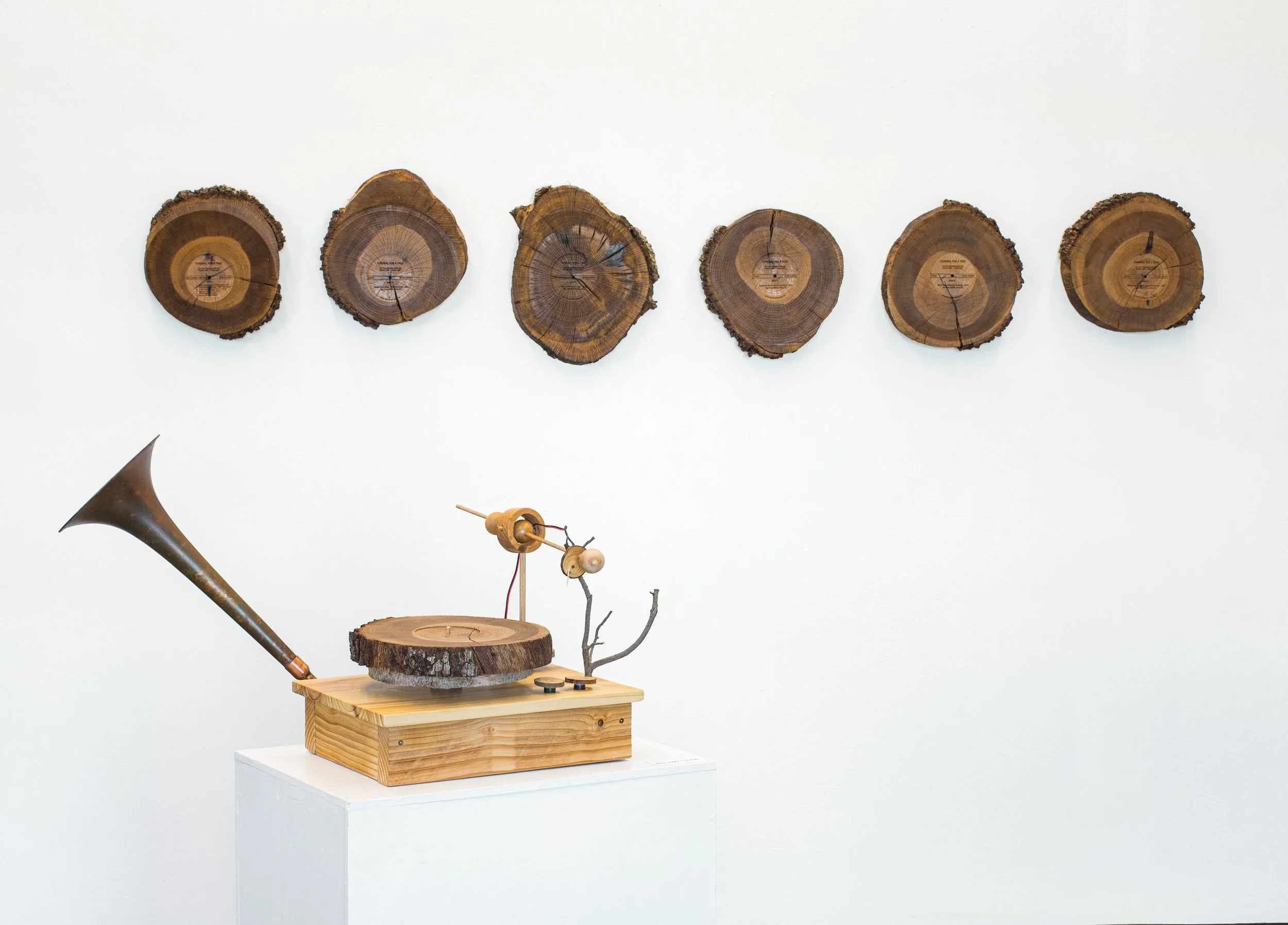 Funeral for a Tree, Steve Parker's second solo exhibition at Ivester Contemporary, is a requiem that a live oak performs for itself. When a 65-year-old tree in Parker’s front yard died of oak wilt, he cut the trunk into “wood cookies” and transformed them into playable records, each encoded with migratory birdsong from species that roosted in the tree across its lifetime. Sheng virtuoso Jipo Yang interprets these songs on the sheng—a Chinese mouth organ associated with rebirth and the phoenix—which appears throughout the exhibition in multiple forms.