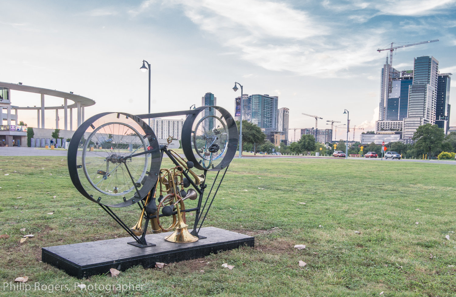 A playable musical instrument sculpture made from a bicycle and reclaimed brass instruments. An imagined collaboration between Marcel Duchamp, John Cage, and Frank Zappa.