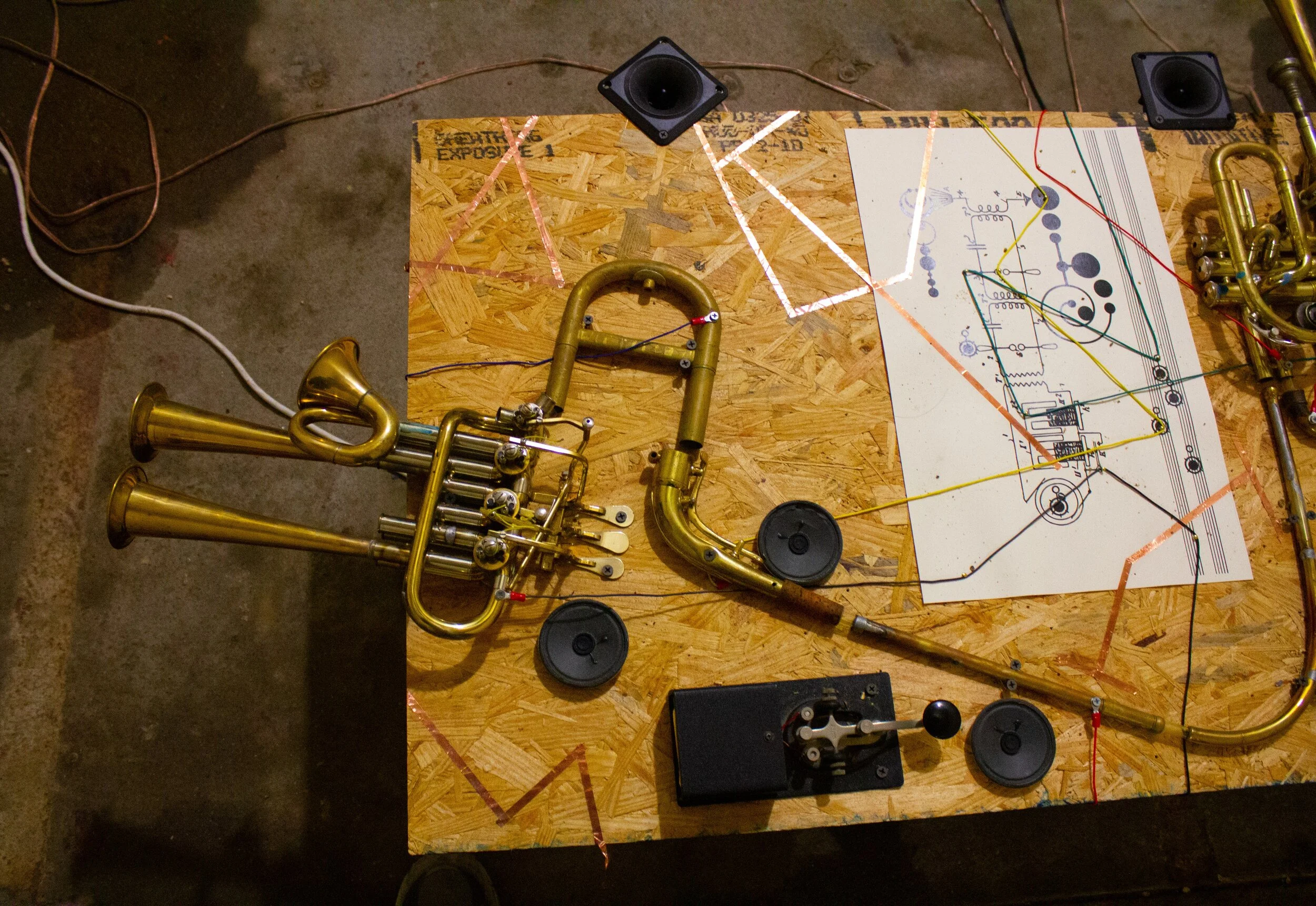 Brass, plywood, wires, printed scores, electronics, speakers, tranducers, audio samples.