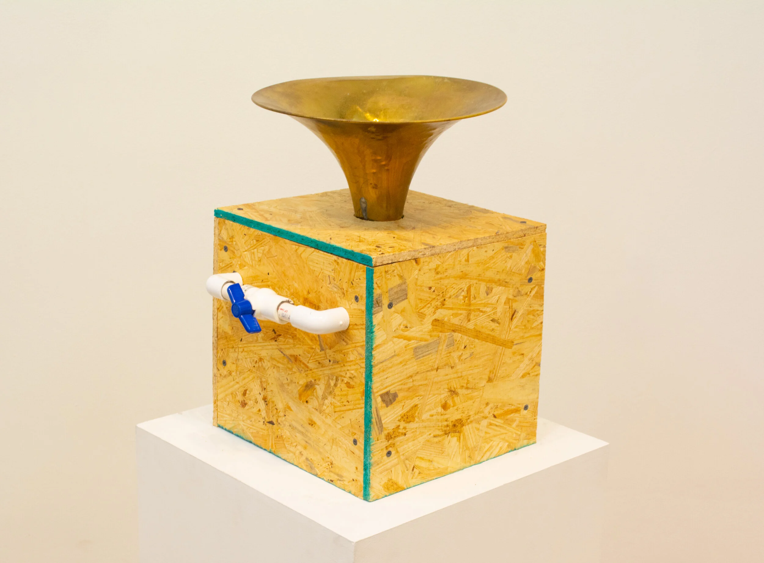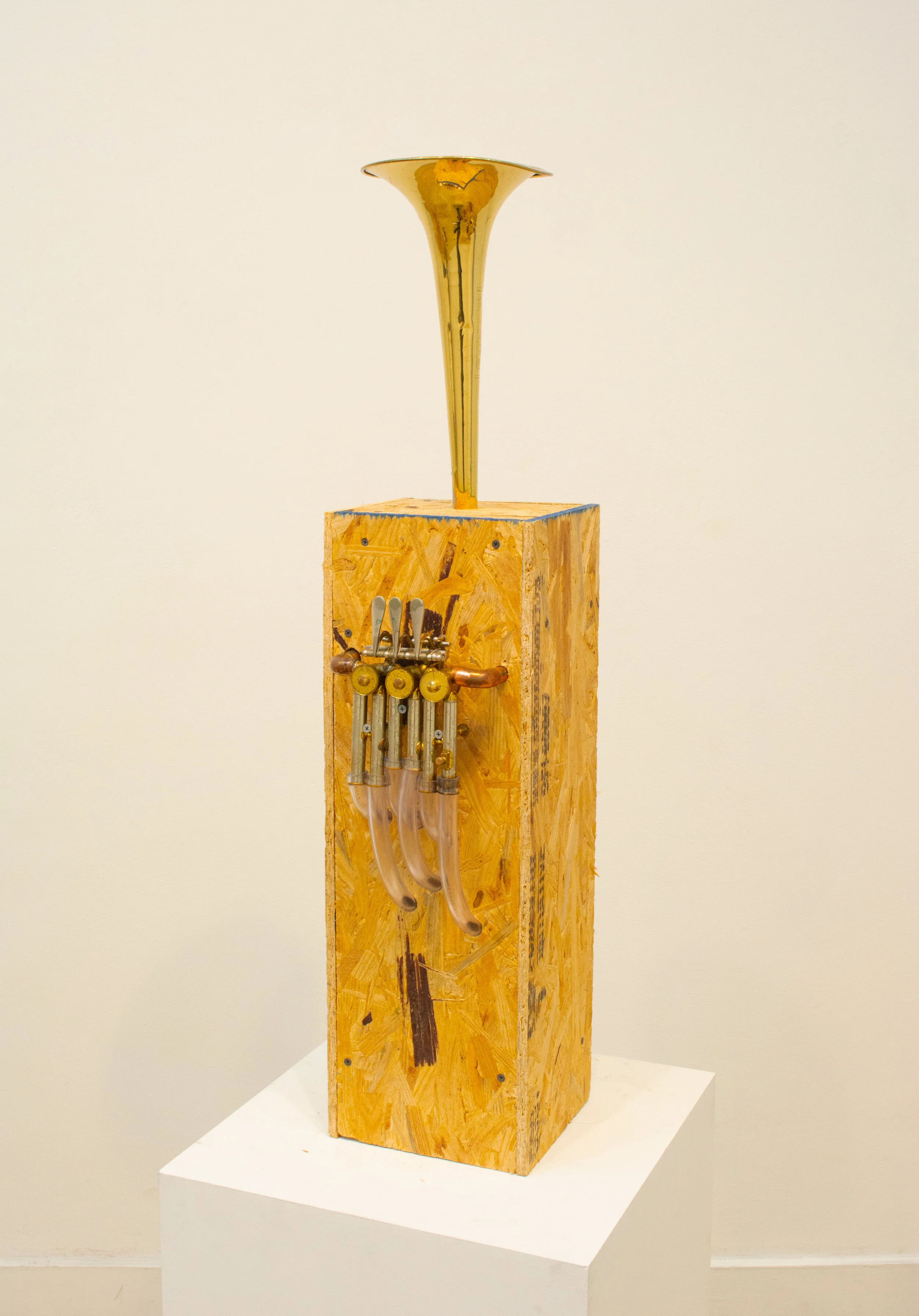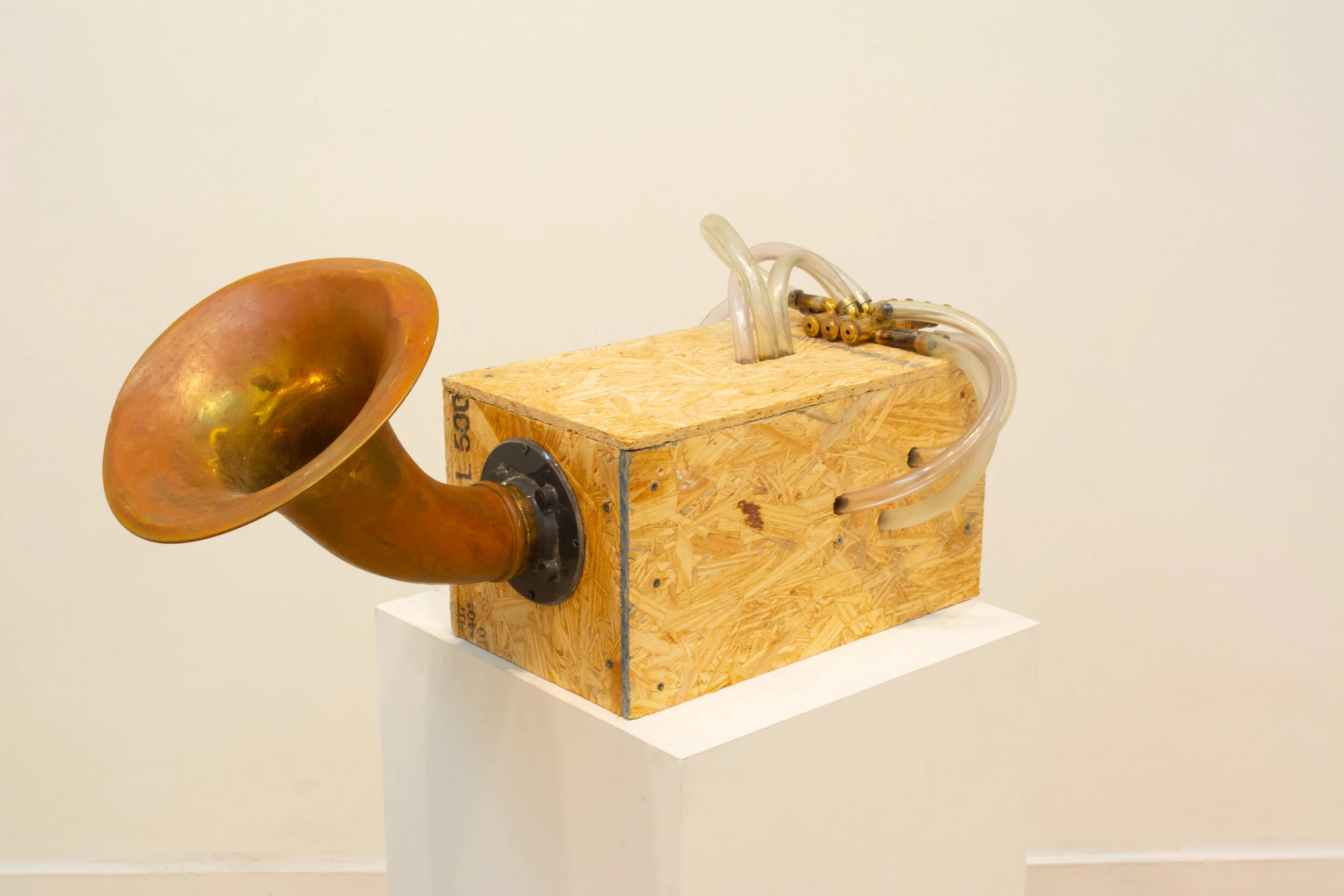 Brass, plywood, copper, vinyl tubing, electronics, audio